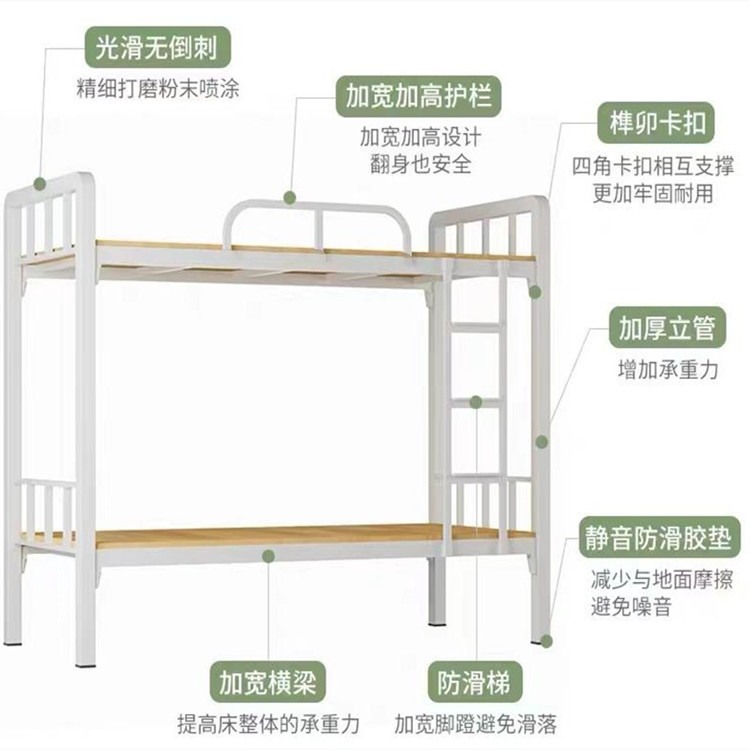现在的中小学宿舍里面,很多都是使用上下铺床。上下铺床这一款宿舍床是双层结构的设计,上下两层床铺都是有五条加厚的床板支撑通过焊接工艺焊接到床架上,这样就不易松动脱落,也让上下铺床的承重能力可以得到提高,我们大家睡觉休息的时候也就更安全。